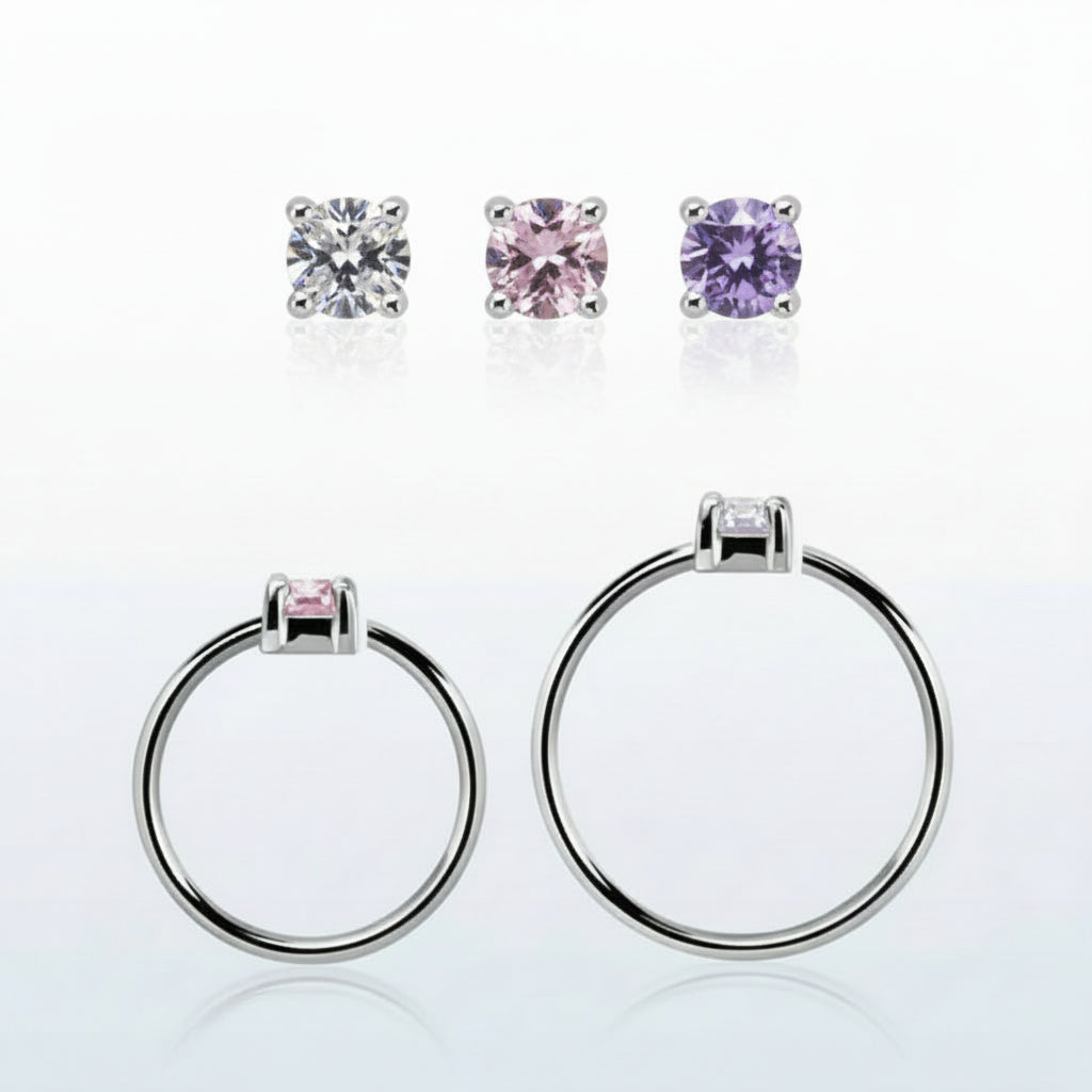 Featuring a single cubic zirconia stone, it's available in four stunning finishes: silver with pink or lavender gems, 18kt gold plating with clear gem, and rose gold plating with clear gem.