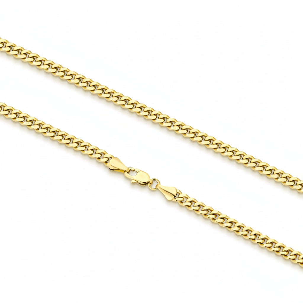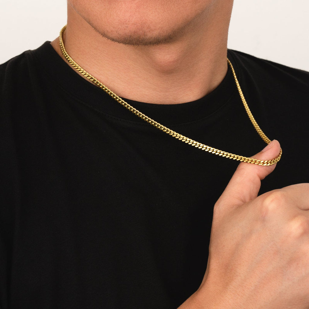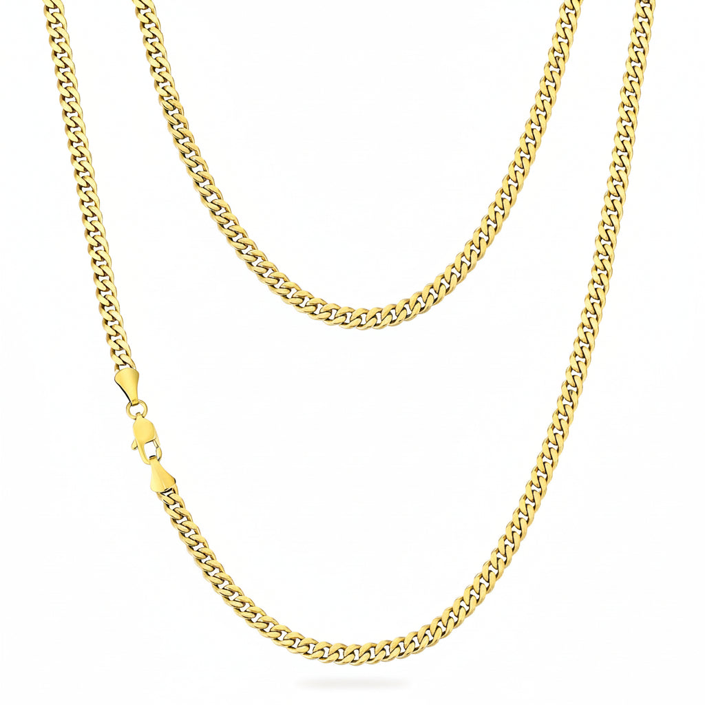 This 4mm Cuban chain pairs surgical-grade stainless steel with 14kt gold plating, delivering a sophisticated look that resists tarnishing and corrosion.
