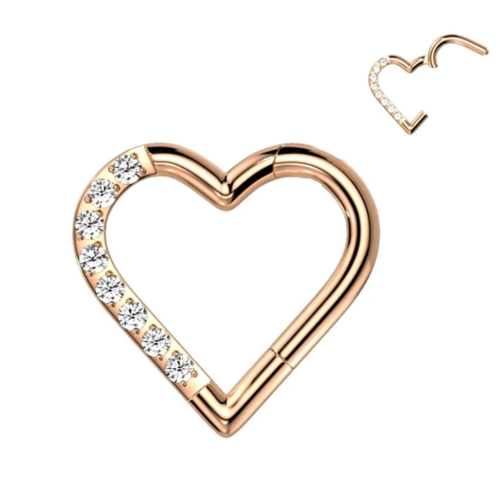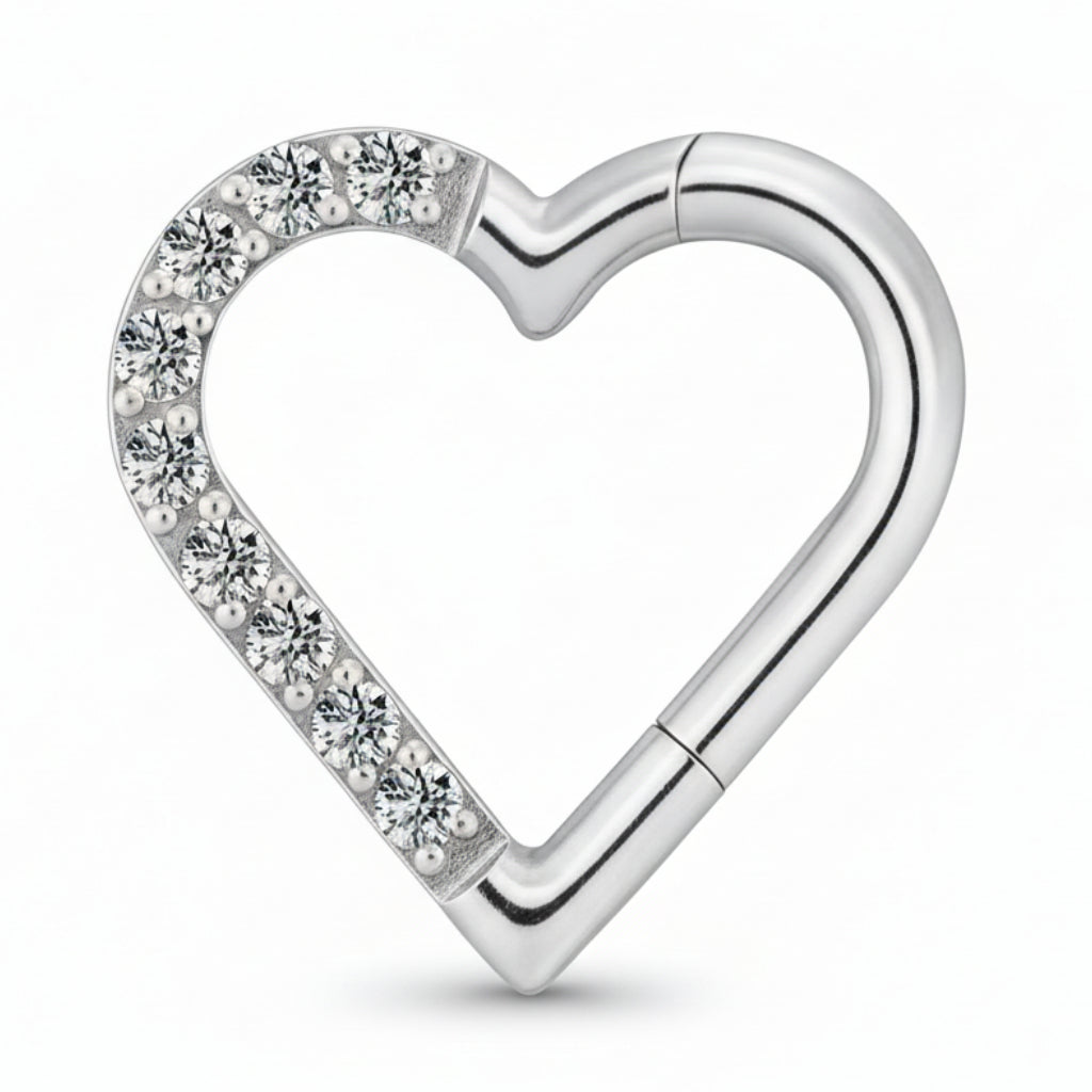 Implant-grade titanium hinged segment hoop featuring a half-pave cubic zirconia heart accent.